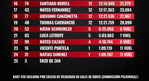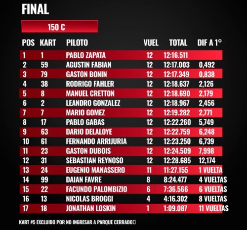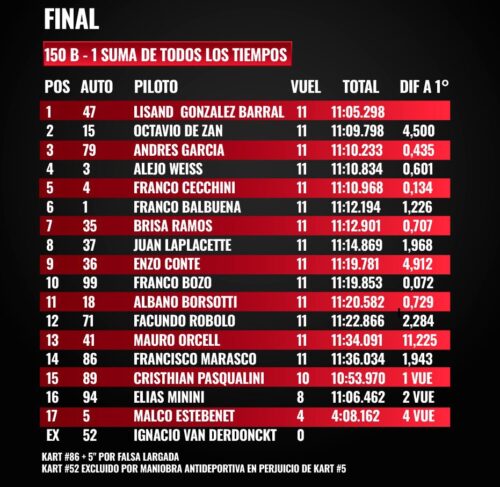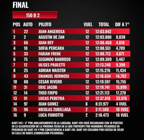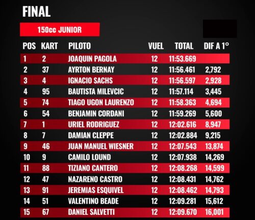 El 1-2 del Christian Roca Competición, con Pagola y Ayrton Bernay, dominó la escena. Ignacio Sachs, ganador en La Paz, completó el podio antes de viajar al debut en la Fórmula 2 Nacional. Milevcic fue cuarto, seguido por Tiago Ugon Laurenzo en su mejor fin de semana. Completaron Cordani, Uriel Rodríguez, Damián Cleppe, JM Wiesner, Camilo Lound, Tiziano Cantero, Nazareno Castro y Jeremías Esquivel, todos los cuales ya supieron ganar alguna vez en el CEK.