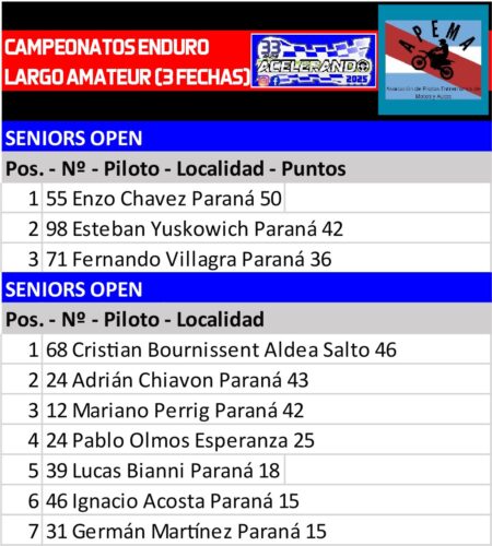 Campeonatos Enduro Largo Amateur I 4 fechas y la próxima2025-10-252025-10-25RELACIONADA Enduro Largo Amateur: después de anclar en Puerto Curtiembre pone proa hacia Piedras Blancas – Acelerando Entre Ríos Compartir: