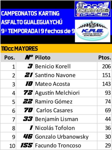 Campeonatos finales 2025 Karting de Asfalto Gualeguaychú2026-01-09RELACIONADA El rugido final del KAG consagró a la sigla 2025 (KAW): Korell, Arnaudin y Waisten – Acelerando Entre Ríos Compartir: