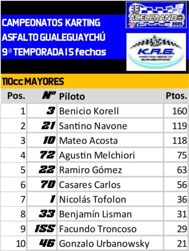 Campeonatos KAG I 7 fechas de 9 y las próximas2025-10-24RELACIONADA Kart de Asfalto: doble dosis de velocidad en Gualeguaychú – Acelerando Entre Ríos Compartir: