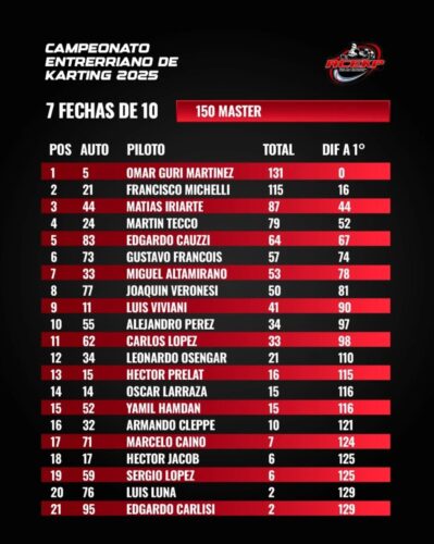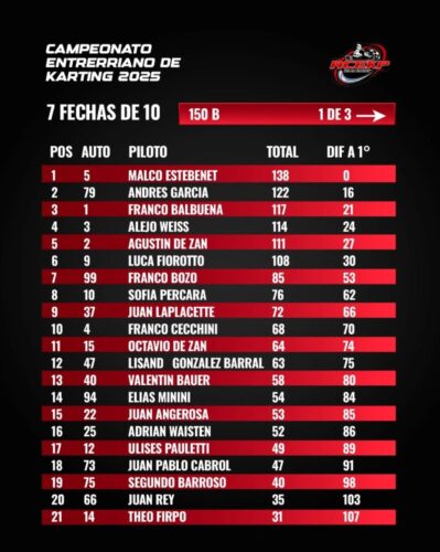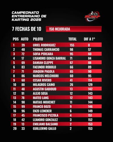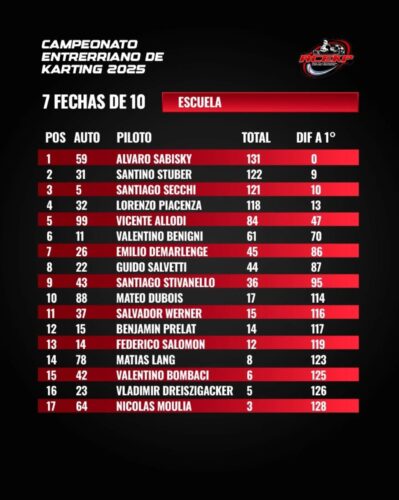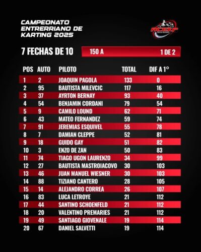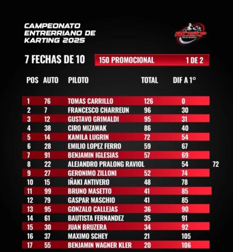 Campeonatos Kart Entrerriano I 7 fechas de 102025-10-032025-10-03RELACIONADA Karting Entrerriano: Gualeguay mantuvo encendida la mecha y La Paz espera la octava – Acelerando Entre Río Compartir: