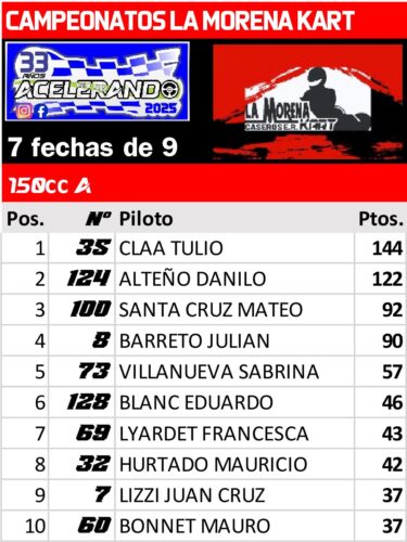 Campeonatos La Morena Kart I 7 fechas de 9 y la próxima2025-10-292025-10-29RELACIONADA La Morena Kart solo retrocede para tomar impulso – Acelerando Entre Ríos Compartir: