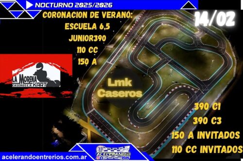 Campeonatos Nocturno de La Morena Kart I 2 fechas de 3 y la próxima2026-02-112026-02-11RELACIONADA Noche de Coronación en Caseros: La Morena Kart acelera hacia la última vuelta – Acelerando Entre Ríos Compartir: