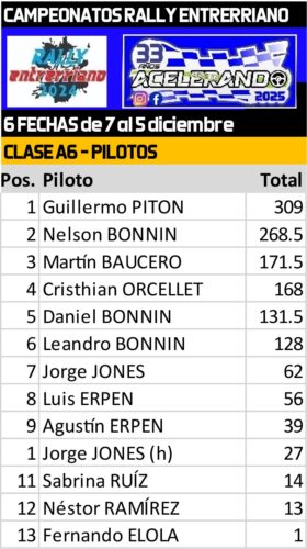 Campeonatos Rally Entrerriano I 6 fechas de 7 al 5 diciembre2025-11-102025-11-11RELACIONADA Los 5 del Rally de Hasenkamp: González no es “Cachi”, es campeón; Manu Cergneux es de primera; Piton, Ramat y García – Acelerando Entre Ríos Compartir:
