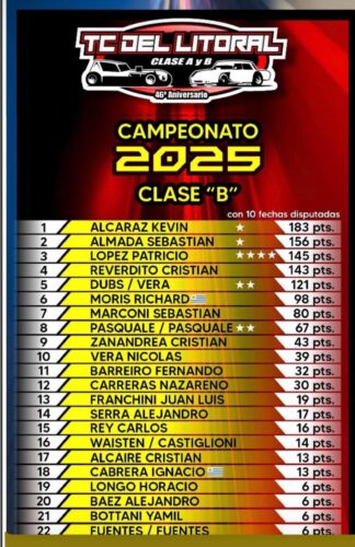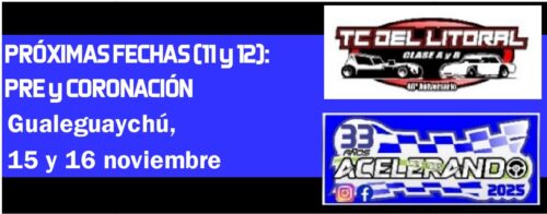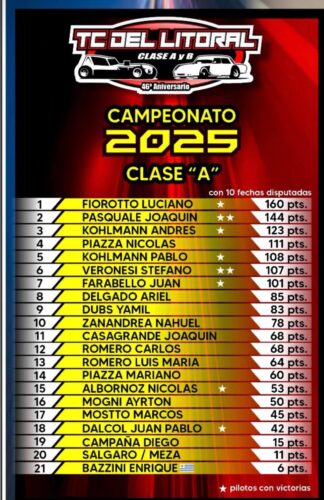 Campeonatos TC del Litoral I 10 fechas de 12 y las próximas2025-10-252025-10-25RELACIONADA TC del Litoral: el Pato López voló otra vez, el campeón no se duerme (en los laureles) y Dalcol los durmió – Acelerando Entre Ríos Compartir: