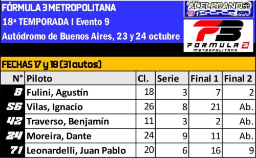 Con intenso calor, una temperatura ambiente de 30 grados y unos cuántos más sobre los bólidos Crespi que integran el parque de la Fórmula 3 Metropolitana, se disputó la primera final de la novena fecha del calendario para la categoría en el autódromo “Roberto Mouras” de La Plata. Fue en la tarde del jueves 23 de octubre, atendiendo a las elecciones generales que se realizaban el 26.
