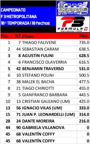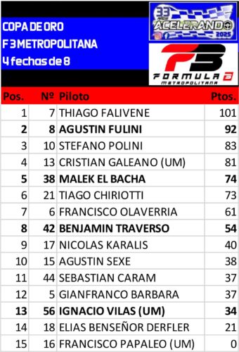 La categoría llega con el eco fresco de La Plata, donde Agustín Fulini —piloto del MAF Racing— firmó un fin de semana sólido, de esos que valen oro en la recta final del torneo. Sus puntos lo mantienen 2º precisamente en la Copa de Oro, con la mira puesta en la corona.