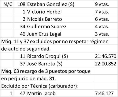 Tras tres vueltas bajo neutralización, quedaban seis para definir todo. En el relanzamiento, Acosta no esperó: en la vuelta 10 dio el golpe y tomó el liderazgo. Detrás, Jacob volvió al ataque y lo superó en la penúltima, pero su maniobra quedaría sin efecto tras la verificación técnica. Sánchez, con ritmo constante, se mantuvo expectante hasta el final, mientras Risso firmaba una gran recuperación desde el fondo del clasificador.