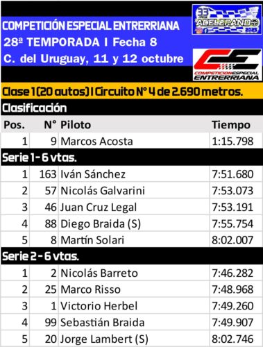 La Clase 1 de Competición Especial Entrerriana volvió a entregar un final digno de una temporada muy pareja. En la penúltima fecha del año, disputada con clima ideal y parque casi completo, la bandera a cuadros consagró primero un ganador y luego otro: en pista vencía Martín Jacob, pero la Técnica dictó sentencia y lo dejó fuera por carburador irregular. Así, el triunfo quedó en manos del uruguayense Marcos Acosta, que no solo se llevó la victoria sino también una valiosa ventaja de puntos rumbo al Coronación.