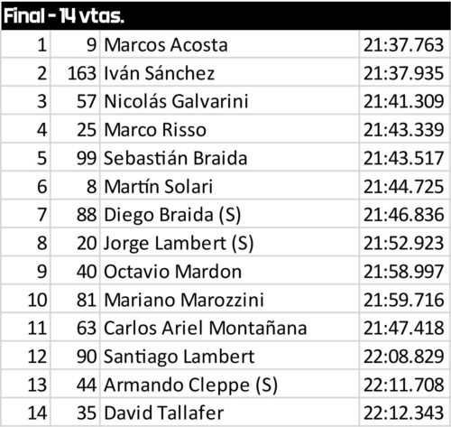 Tras tres vueltas bajo neutralización, quedaban seis para definir todo. En el relanzamiento, Acosta no esperó: en la vuelta 10 dio el golpe y tomó el liderazgo. Detrás, Jacob volvió al ataque y lo superó en la penúltima, pero su maniobra quedaría sin efecto tras la verificación técnica. Sánchez, con ritmo constante, se mantuvo expectante hasta el final, mientras Risso firmaba una gran recuperación desde el fondo del clasificador.