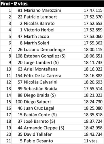 Las múltiples incidencias reconfiguraron el clasificador: Patricio Lambert heredó el segundo puesto definitivo; Nicolás Barreto ascendió al tercero tras haber estado noveno a cuatro vueltas del final; Victorio Herbel fue 4º y completó el podio del campeonato. Detrás se ubicaron Martín Jacob, Martín Solari, Luciano Demarlenge, el uruguayo Esteban González y Jorge Lambert (foto junto a Diego Braida), estos dos últimos primero y segundo de la Copa Seniors, cerrando así el selecto top ten de la carrera más numerosa del año.