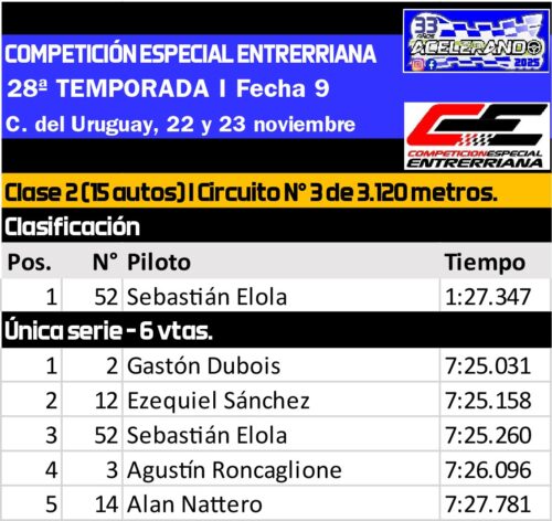 La Clase 2 de Competición Especial Entrerriana escribió un coronación a la altura de su crecimiento. Fue la carrera de las ratificaciones, del campeón que no dejó dudas y del parque más nutrido en la joven historia de la divisional: 15 autos en pista, repitiendo la imponente convocatoria del día anterior.