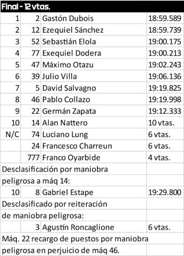 El crecimiento del parque se tradujo en una final vibrante, áspera y cambiante, que tuvo su quiebre con el ingreso del auto de seguridad en la vuelta 8 de las 12. Hasta ese momento, Dubois manejaba la competencia sin margen para relajarse, con Agustín Roncaglione brillando como escolta en su primera presentación del año. Pero una sucesión de maniobras encadenadas derivó en su abandono y posterior exclusión, dejando además fuera de combate a Luciano Lung, con su unidad seriamente dañada.