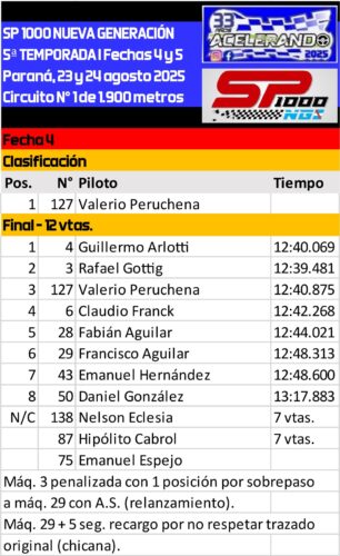 En la divisional SP 1000 Nueva Generación, la final sabatina parecía en manos de Rafael “Chapu” Gottig, pero una penalización por sobrepaso bajo auto de seguridad le quitó su primer triunfo. La victoria quedó en manos del lapaceño Guillermo Arlotti, que se llevó además el premio extra a la mejor maniobra: un dos por uno memorable sobre Claudio Franck y Valerio Peruchena en el retome, cuando la carrera ya quemaba sus últimos giros.