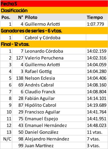La prueba tuvo todos los condimentos: Nelson Eclesia liderando en el inicio con su regreso a los primeros planos, Franck al comando tras la mitad de carrera y un final de película con Arlotti aprovechando cada resquicio. El top 5 lo completaron Fabián y Francisco Aguilar, seguidos por Emanuel Hernández y Daniel González, clasificador que no integraron Eclesia, Poly Cabrol y el debutante Emanuel Espejo.