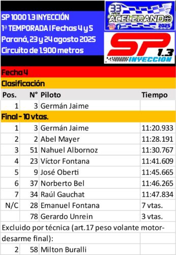 El saldo de Paraná dejó dos historias: el dominio absoluto de Jaime en la primera final y el triunfo inesperado de Bel en la segunda, convertido en el primer piloto no entrerriano en ganar en la Inyección 1.3. Un fin de semana que, otra vez, recordó que en esta categoría nada está definido hasta el cierre de la técnica.