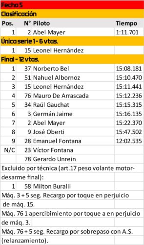 Un instante antes Nahuel Albornoz y Abel Mayer se rozaban en pleno último tránsito por la olla, yendo al trompo el de Gral. Ramírez, que arribó 8º, recuperando un lugar por la exclusión del primero, quedando en definitiva detrás de Emanuel Hernández (en su primer podio), De Arrascada, Gauchat y Jaime (6º en vez de 4º por un recargo).