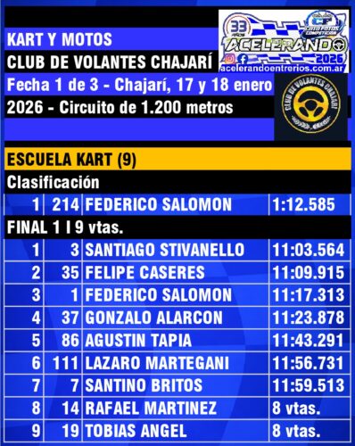 Del lado del kart, la madrugada dejó una lista pesada de ganadores y varias historias para subrayar. En Escuela, festejaron Santiago Stivanello y Fede Salomon; Elena Marzoratti se llevó la única final de Escuela Light; en 150cc A festejaron Lucio Alcalá (campeón 2025 del nocturno) y Nico Scatolaro; en 150cc B ganaron Gabriel Chiesa (campeón vigente del mini) y Nahuel Zanandrea; en 150cc C se repartieron la gloria Miguel Ángel Álvarez y Juan Durante; y en 150cc Promocional asomaron Gerónimo Zilloni y Bautista Fernández.