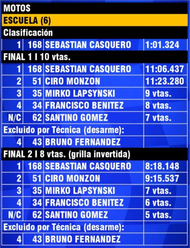 En Escuela, el local Sebastián Casquero (168) siguió en modo “dueño de casa”: dos finales, dos victorias, y con el mismo orden clavado como calco: Ciro Monzón P2 y el concordiense Mirko Lapsynski P3 en ambas.
