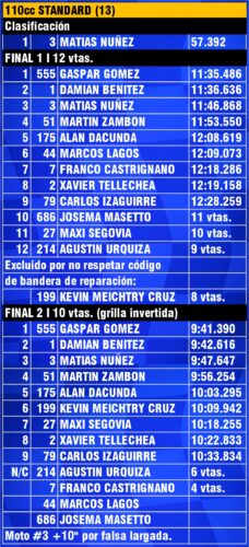 La apertura fue larga, larguísima: 17 finales y una serie para bajar la persiana casi a las 5 de la mañana, cuando Gaspar Gómez volvió a plantarse en lo más alto en 110cc Standard. En motos también metieron firma fuerte Nahuel López en Súper Vale Todo y Sebastián Casquero en Escuela, el mismo que venía de calzarse la corona 2025 el 13 de diciembre y arrancó el nocturno como quien no piensa aflojar.