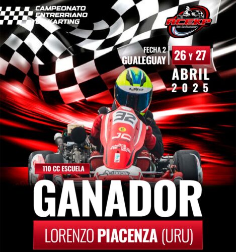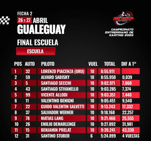 ESCUELA. LA EMOCIÓN HASTA EL ÚLTIMO MILÍMETRO. Precisamente, continuando con la exitosa legión uruguaya en Escuela (Eddy Mion y Gonzalo Callejas fueron campeones), en Gualeguay fue el turno del sanducero Lorenzo Piacenza, quien tuvo un fin de semana de película: fue cuarto en una clasificación apretadísima, dominó con autoridad su serie, y en la final protagonizó un duelo épico con Álvaro Sabisky, al que superó por apenas 0.039 segundos sobre la línea de sentencia. “Fue de menor a mayor durante todo el fin de semana”, destacó Iván Artiguez, testigo de una carrera electrizante.