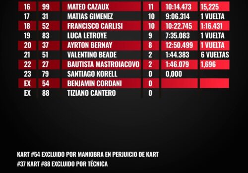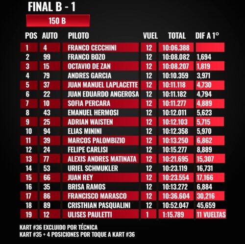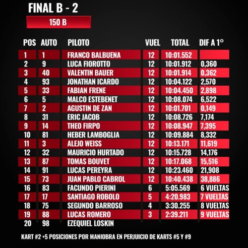 En un cierre ajustado, Luca Fiorotto —otro ex monarca— fue segundo, seguido por Valentín Bauer, que dejó una grata impresión en su segunda incursión en la B tras subir desde Junior. El cuarto y quinto lugar fueron para Jony Icardo y Fabián Frene, en la mejor carrera de ambos hasta aquí.