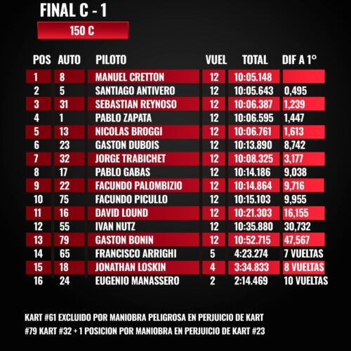 En la Final 1, llegó el momento más esperado para Manuel Cretton, quien celebró su primera victoria en la divisional Mayores C. El sanjosecino tuvo un fin de semana sólido: 7º en clasificación, 3º en la serie, donde además marcó el récord de vuelta, y finalmente largó desde el cajón 4 la final. Allí mostró gran inteligencia para evitar un incidente en el pelotón de punta y capitalizar su ritmo para alzarse con el triunfo.