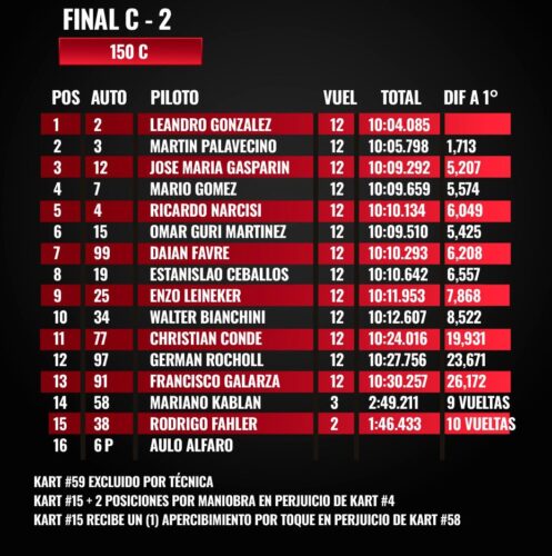 La Final 2 tuvo como protagonista excluyente a Leandro González, apodado El Palomo, quien no solo se quedó con la carrera sino que con esa actuación saltó a la punta del campeonato. En el podio lo acompañaron el ex campeón Martín Palavecino y José María Gasparin, mientras que Mario Gómez y Ricky Narcisi completaron un competitivo top cinco, quedándose a las puertas del podio.