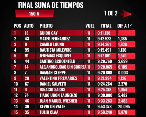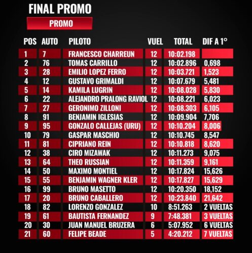 La suma de tiempos dio como escolta a Mateo Fernández, seguido por Camilo Lound, Bautista Milevcic y Jeremías Esquivel, este último en apenas su segunda carrera tras el ascenso desde Promocional.
