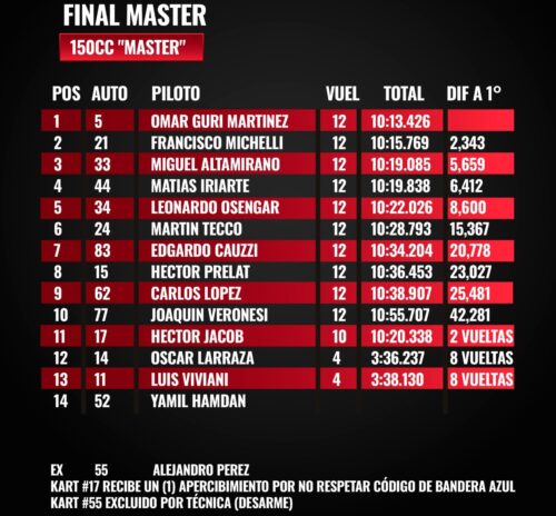 MASTER 150CC C: EL GURÍ NO AFLOJA. La nueva divisional Master 150cc C (ex Copa) tuvo nuevamente al Gurí Omar Martínez como vencedor, en una muestra de vigencia y clase. Esta vez lo acompañaron en el podio Francisco Michelli y el villaguayense Miguel Ángel Altamirano, quien regresó a la actividad tras una larga pausa. Matías Iriarte fue 4º y Leo Osengar, otro que volvió, completó el top 5.
