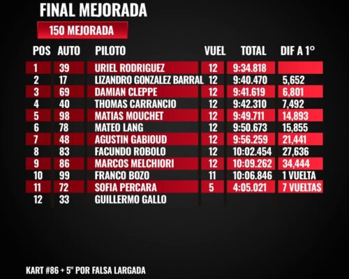 150CC STD. MEJORADA: URIEL RODRÍGUEZ SE DESQUITA. En la segunda fecha de la categoría 150cc Std. Mejorada, el actual campeón de Junior, Uriel Rodríguez, se quedó con una victoria clave que lo convierte en el nuevo líder del torneo. En el podio lo acompañaron Lisandro González Barral, bicampeón del Citroën Competición, y el de Colonia Elía, Damián Cleppe, sumándose a esta divisional en Gualeguay.