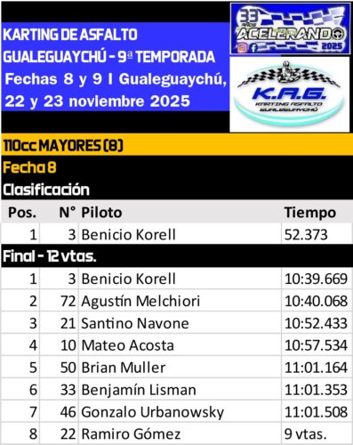 Con ocho pilotos en pista, la 110cc Mayores tuvo un cierre a la medida de su dominador. Benicio Korell (3) volvió a marcar el pulso del fin de semana ganando ambas finales y alcanzando así su sexto triunfo en nueve presentaciones. Detrás, Agustín Melchiori celebró su mejor actuación en la categoría: fue segundo el sábado, llegó a liderar la final en su tramo intermedio y además se quedó con el récord de vuelta.