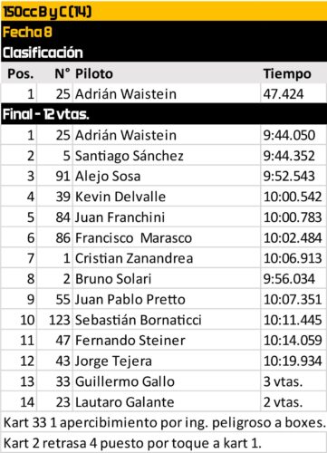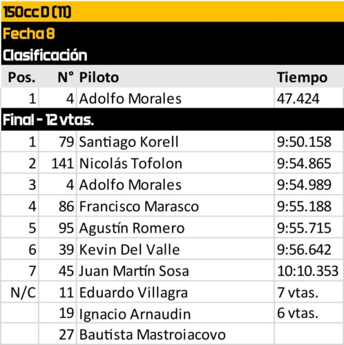En la 150cc D, el sábado dejó abierta la pelea. Adolfo Morales logró descontarle 13 puntos a Ignacio Arnaudin gracias a su clasificación y al tercer puesto en la final, mientras el líder abandonaba. La victoria fue para Santiago Korell (79), su tercera en cuatro presentaciones, en una carrera que tuvo lucha cerrada por el podio entre Nico Tofolon —que ese fin de semana despedía el título de 110cc Mayores— y el propio Morales, detrás de quienes inmediatamente arribaban Francisco Marasco (ganador de la fecha 6), Agustín Romero y Kevin Del Valle.