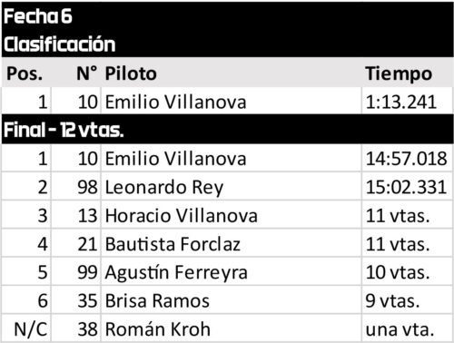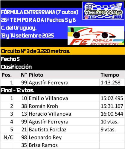 Así, en una categoría donde la paridad se escribe más en la tabla que en la pista, tres de los cuatro pilotos con asistencia perfecta —junto al propio Villanova— mantienen encendida la disputa por el título en una Fórmula Entrerriana que resiste, aunque a pulso de nostalgia y tenacidad.