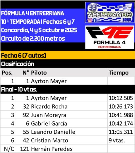 La temporada 2025 entra en su tramo final y tanto la Fórmula 4 Entrerriana (ex Fórmula Renault Entrerriana) como el Turismo Pista 1600 se preparan para bajar el telón el 15 y 16 de noviembre en Paraná, luego de su discreto paso por Concordia.