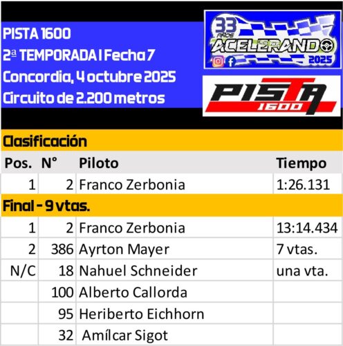 El Turismo Pista 1600, por su parte, tuvo acción solo el sábado en Concordia, con seis autos inscriptos. Sin series y con una final recortada —que terminó una vuelta antes de las diez pactadas—, la bandera a cuadros solo cayó sobre el Fiat Uno de Franco Zerbonia, único sobreviviente en pista.