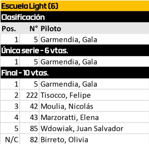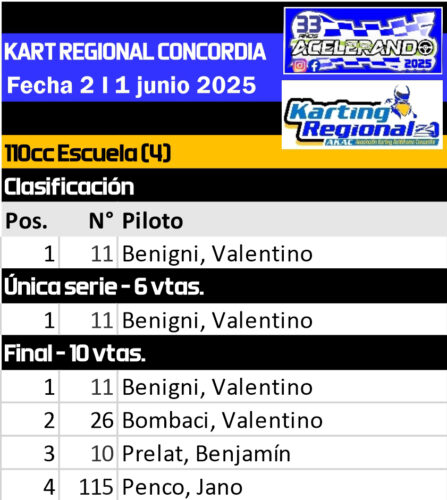 En Escuela (4) prevaleció la experiencia de Valentino Benigni, de permanente presencia en el Kart Entrerriano, ganador de las tres instancias, en la final sucedido por Valentino Bombaci, Benja Prelat y Jano Penco.