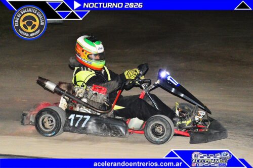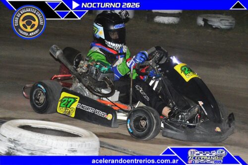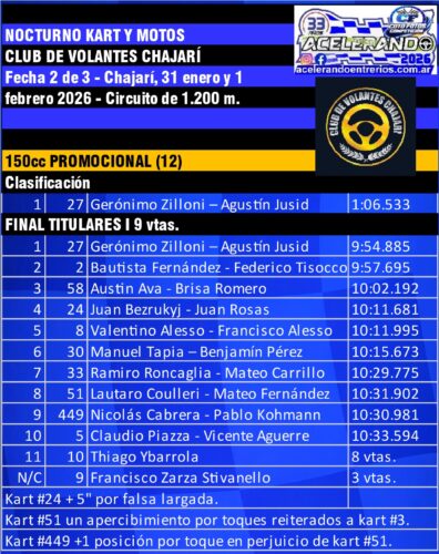 La Promocional 150cc, la más pareja del combo Kart y Motos Chajarí, ya tiene perfume de final de película: Bautista Fernández (2) y Gerónimo Zilloni (27) llegan al coronación igualados en puntos. En la noche, cada uno se quedó con una: la de titulares fue para Zilloni; la de invitados se la llevó el kart de Fernández bajo la conducción de Federico Tisocco (2), que hasta el 13 de diciembre de 2025 corría en Promo y en este Nocturno ya se animó a 150cc A.