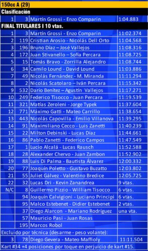 En 150cc A el parque trepó de 26 a 29 (récord del Nocturno hasta aquí) y la victoria tuvo acento correntino en ambas finales: Martín Grossi (3) entre titulares y José Vallejos (con el kart 196 de Bruno Díaz) entre invitados. Sin ganar, pero haciendo negocio grande, Cristian Arosio sostuvo la punta del campeonato (2º en la suya y 4º su invitado Nico Dell Orto). Ojo: Tomás Bravo llega al coronación a solo 8 puntos, y atrás asoma Federico Tisocco como revelación, sin descartar a Scatolaro y Díaz.