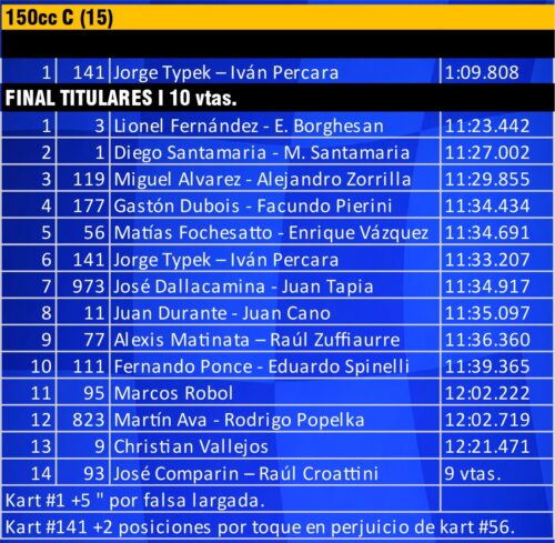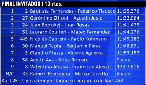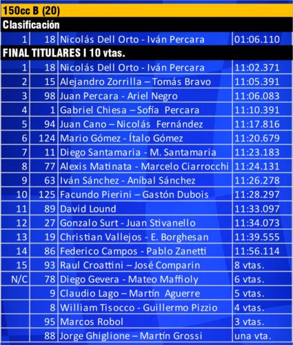 La B “desentonó” por cantidad al bajar de 26 a 21, pero el golpe de escena fue total: Nico Dell Orto e Iván Percara (18) ganaron las dos finales con el mismo kart y dejaron la definición mano a mano con el campeón defensor Gabriel Chiesa, que fue 4º entre titulares y 2º en la de invitados (con Sofía Percara).