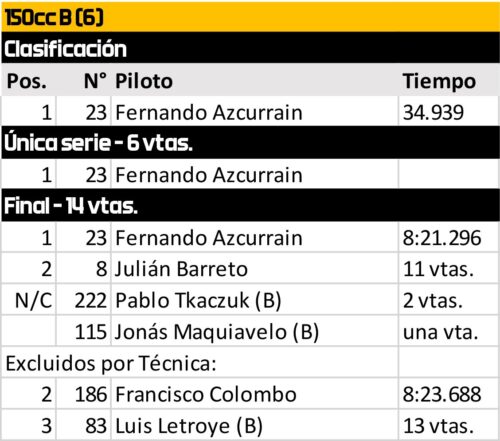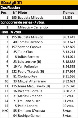 Las unificadas A y B de 150cc, con 17 karting y sin la Clase C para este certamen, ofrecieron uno de los grandes duelos del fin de semana. Bautista Milevcic se quedó con la victoria tras un intenso mano a mano con Thomás Carrancio, sellando un 1-2 para Caseros entre dos regresos de peso. Detrás, el nogoyaense Santino Canova se adueñó del tercer escalón del podio, relegando a Tulio Claa y Julián Barreto. En ese contexto, Luis Letroye fue el mejor de los B con una valiosa sexta posición.