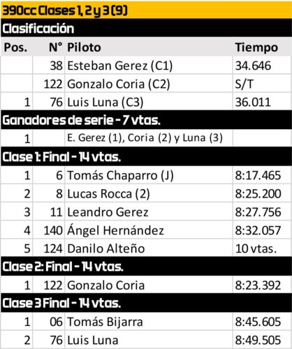 Entre las tres clases y la Junior de 390cc se armó una final “todas juntas”, con nueve karting en pista. Tomás Chaparro se impuso en la general y en la última de esas cuatro, donde fue el único participante; Lucas Rocca festejó en la 1; Gonzalo Coria en la 2; y Tomás Bijarra en la 3, divisional que marcó el debut del ex campeón nocturno de 110cc Mayores, Luis Luna.