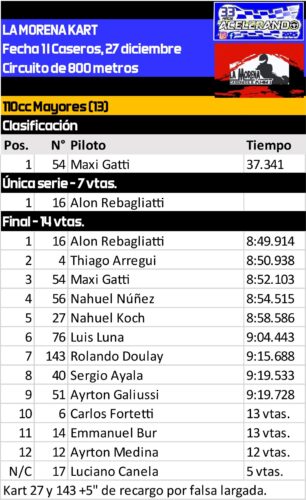 En 110cc Mayores, trece fueron los protagonistas de una noche que quedará marcada por el bautismo triunfal de Alon Rebagliatti (16). El piloto de Urdinarrain escribió su primera victoria en La Morena Kart, escoltado de cerca por Tiago Arregui, mientras que Maxi Gatti, autor de la pole, celebró su primer podio (foto) en la divisional.