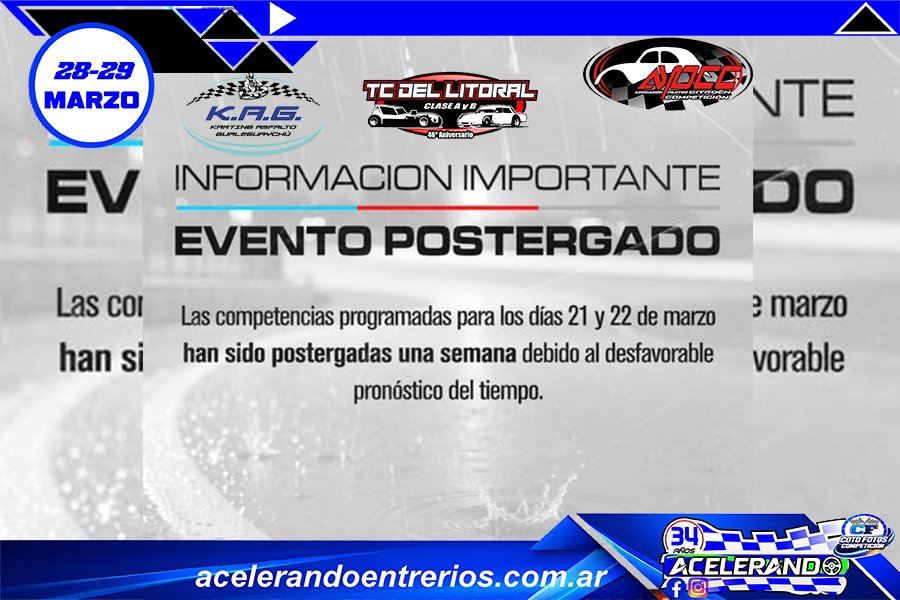 De esta manera, el TC del Litoral, Citroën Competición y el Karting de Asfalto Gualeguaychú ven nuevamente alterado su cronograma de inicio, estirando la cuenta regresiva hacia el último fin de semana del mes.