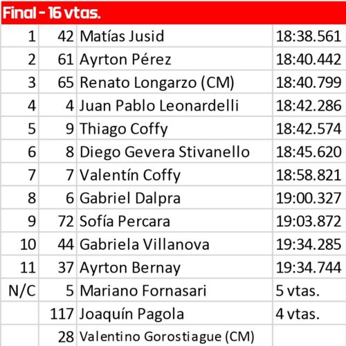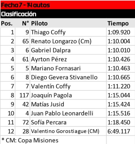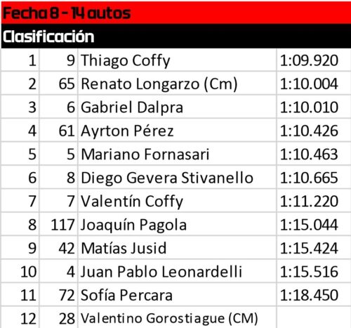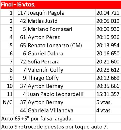 En cambio, se confirmó la sanción de 5 segundos a Renato Longarzo por falsa largada, lo que lo desplazó del podio al 5º lugar, detrás de Mariano Fornasari (3º) y Ayrton Pérez (4º). También se mantuvo la penalización a Thiago Coffy por una maniobra en perjuicio de su hermano “Tachu”, por lo que cayó del 5º al 9º puesto. Gabriel Dalpra (6º), Sofía Percara (7ª), Ayrton Bernay (8º) y JP Leonardelli (10º) completaron el clasificador.