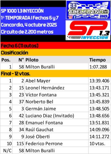 En la SP 1000 Inyección 1.3, el de General Ramírez, Abel Mayer, se quedó con lo más importante del fin de semana. Aunque Milton Buralli y Leonel Hernández dominaron las clasificaciones y Buralli la serie única, Mayer impuso condiciones en las dos finales y se llevó un doblete clave que lo deja a las puertas del campeonato 2025.