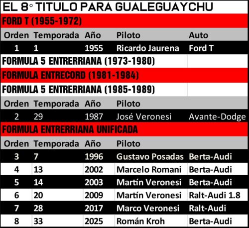 La Fórmula Entrerriana tiene nuevo rey y su nombre quedó sellado para siempre el 23 de noviembre de 2025. No fue una sorpresa absoluta, porque al momento de reunir los últimos requisitos era quien más argumentos había exhibido a lo largo del año, pero sí fue una historia cargada de épica: Román Kroh es el nuevo campeón de la legendaria categoría, en una jornada que también quedará en la memoria por la primera victoria de Leonardo Rey, el segundo correntino en subir a lo más alto del podio de la FE.