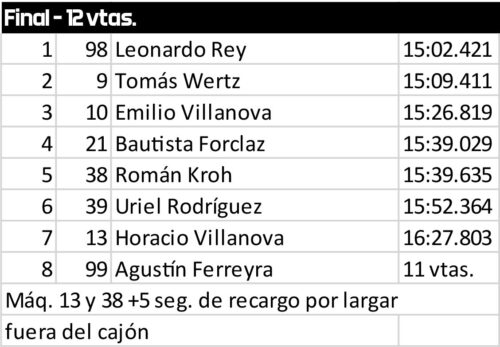 Con el tablero casi definido, Kroh giraba rumbo a una doble meta: la de la carrera y la del campeonato. Emi Villanova sostenía el tercer lugar, Ferreyra se desquitaba marcando el récord de vuelta en la penúltima y Bautista Forclaz se afirmaba en la cuarta posición.