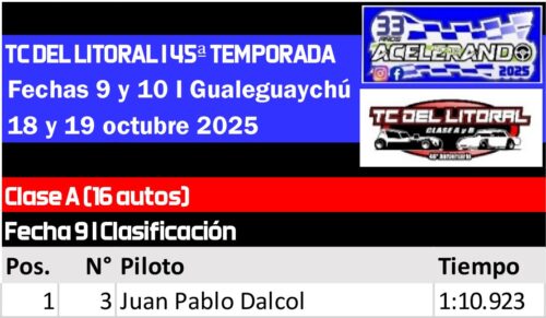 Una jornada brillante, cargada de emociones y motores al límite, fue la que el TC del Litoral vivió el fin de semana del 18 y 19 de octubre, en un tributo perfecto al Día de la Madre. La doble fecha dejó nuevos nombres grabados en la historia: Andrés Kohlmann y Juan Pablo Dalcol se sumaron a la extensa lista de ganadores de la Clase A, mientras que en la Clase B el inquebrantable “Pato” Patricio López repitió dominio con su Chevy blanca, logrando su segundo y tercer triunfo consecutivos —cuatro en lo que va de la temporada—.