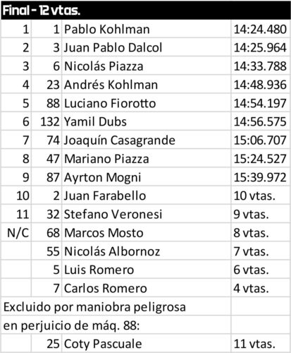 Nico Piazza completó otra gran actuación, mientras que Andrés Kohlmann —actual campeón de la Clase B— escaló al cuarto lugar tras una maniobra clave en la última vuelta, cuando Joaquín Pasquale tocó a Luciano Fiorotto en el frenaje de la 2 (fotos), acción que le valió la exclusión. Detrás se ordenaron Fiorotto, Joaquín Casagrande, Mariano Piazza y Ayrton Mogni, completando el lote principal.